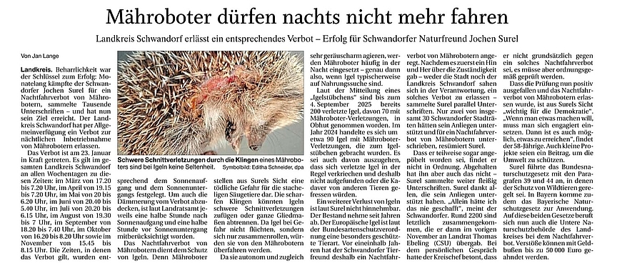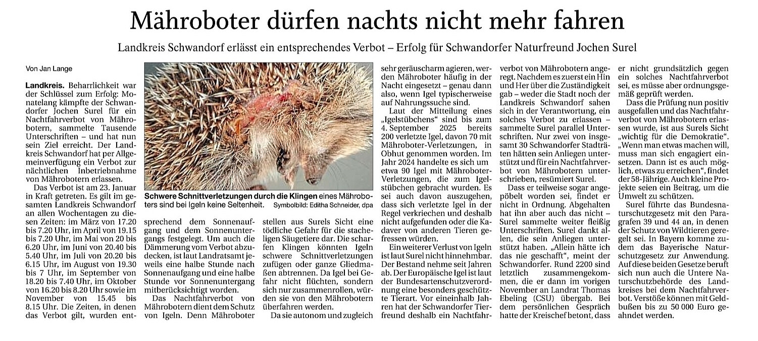 Großer Erfolg für den ÖDP-Ortsvorsitzenden Jochen Surel aus Schwandorf. Nachdem er tausende Unterschriften für ein Nachtfahrverbot von Mährobottern gesammelt u. diese persönlich beim Landrat abgegeben hat, erließ nun das Landramtsamt eine Allgemeinverfügung die für den gesamten Landkreis Schwandorf ab sofort gütlig ist.