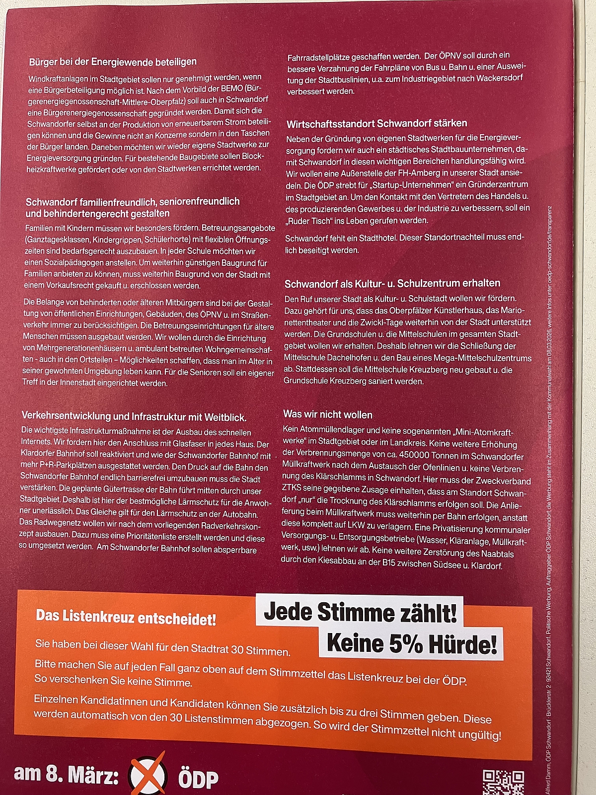 Das ÖDP-Wahlprogramm für die Stadtratswahl Schwandorf 2026